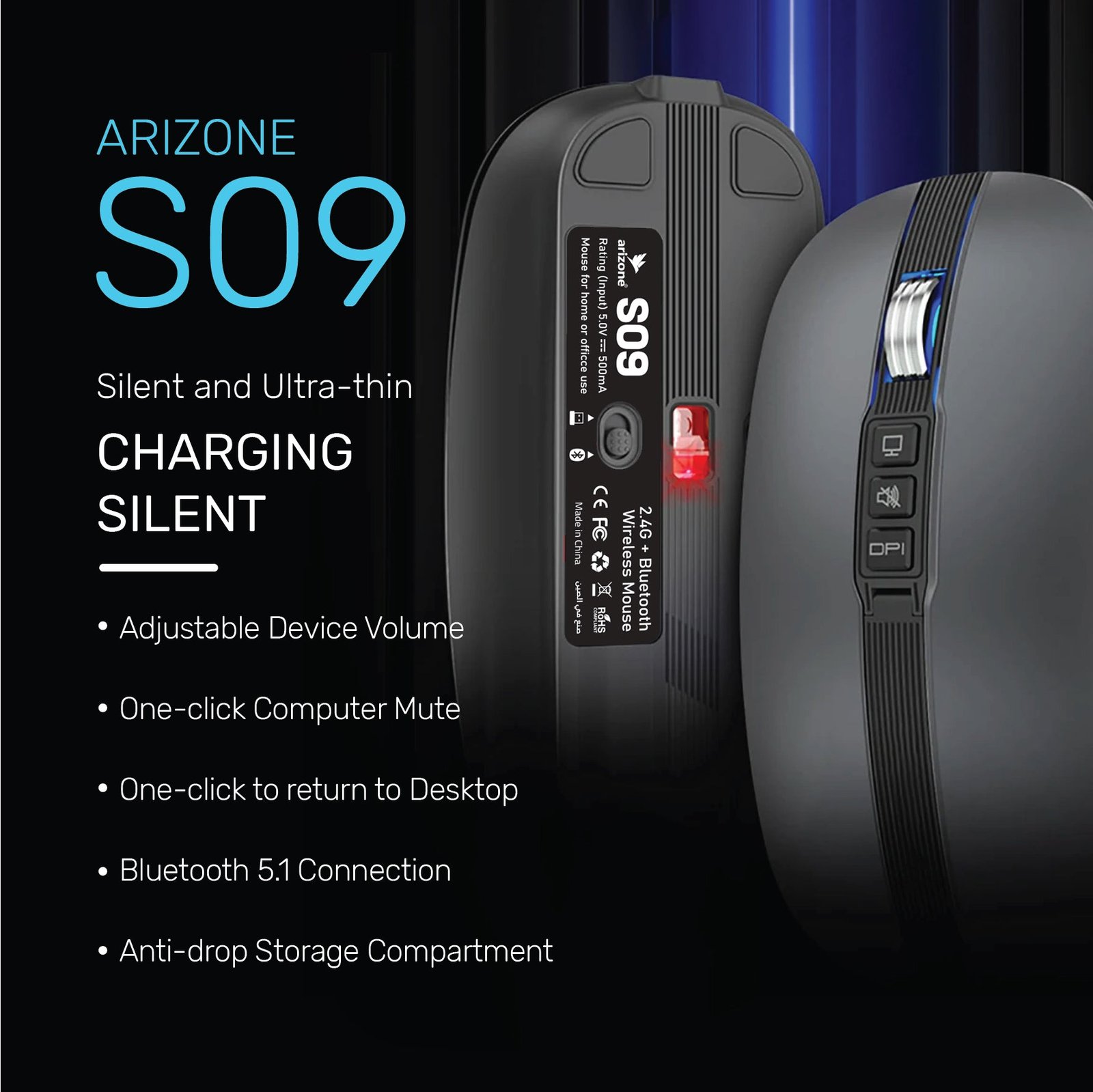 Arizone Wireless Mouse Rechargeable,Upgrade LED Mouse for Laptop, Silent Mouse Bluetooth with USB 2.4GHz 1600dpi